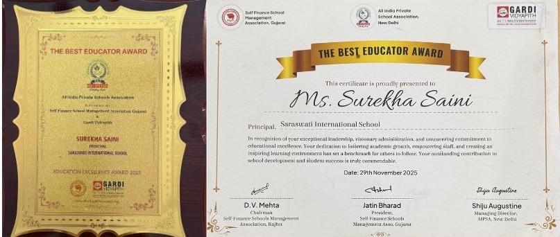 Saraswati International School is bursting with pride! We are thrilled to announce that our esteemed Principal Ma’am, Ms. Surekha Saini, has been conferred with the highly coveted "The Best Educator Award". This major distinction, presented by the Self Finance School Management Association (Gujarat) and AIPSA (New Delhi), is a powerful recognition of her exceptional leadership, visionary administration, and unwavering commitment to educational excellence. Ms. Saini has set an undeniable benchmark for fostering academic growth, empowering our staff, and creating an inspiring learning environment where every student thrives. The award acknowledges that Ms. Saini has created an environment that is truly commendable and a model for others to follow. This award confirms what we already know: we are led by the very best!